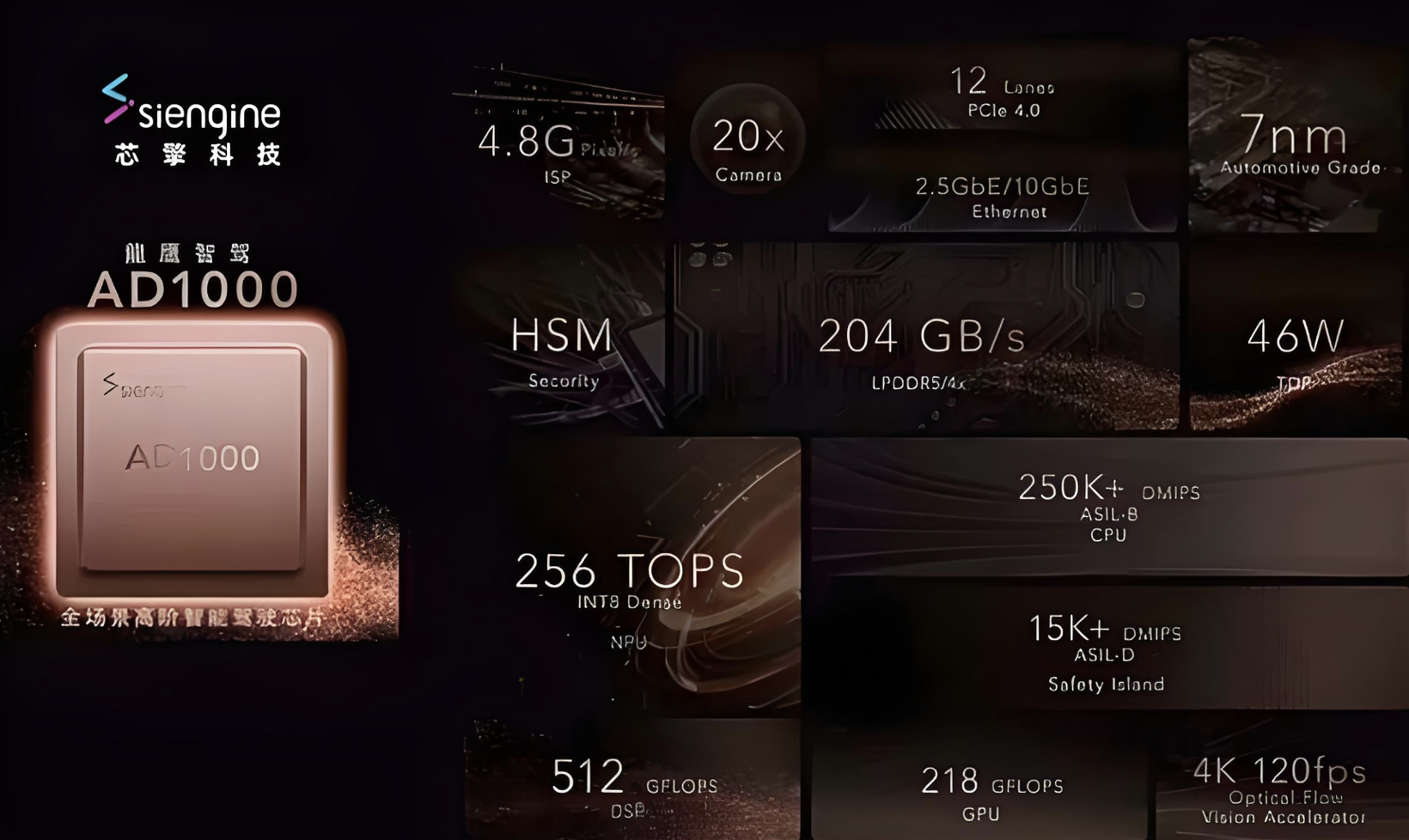 在智驾芯片方面,2024年春季,芯擎科技正式发布亮相其新一代智驾芯片AD1000,基于7nm制程打造,单颗芯片算力256TOPS。